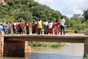 Members of Chitsanzo Group celebrating that they now have a bridge in their community that they constructed and  cleared waterway to reduce risks of flooding